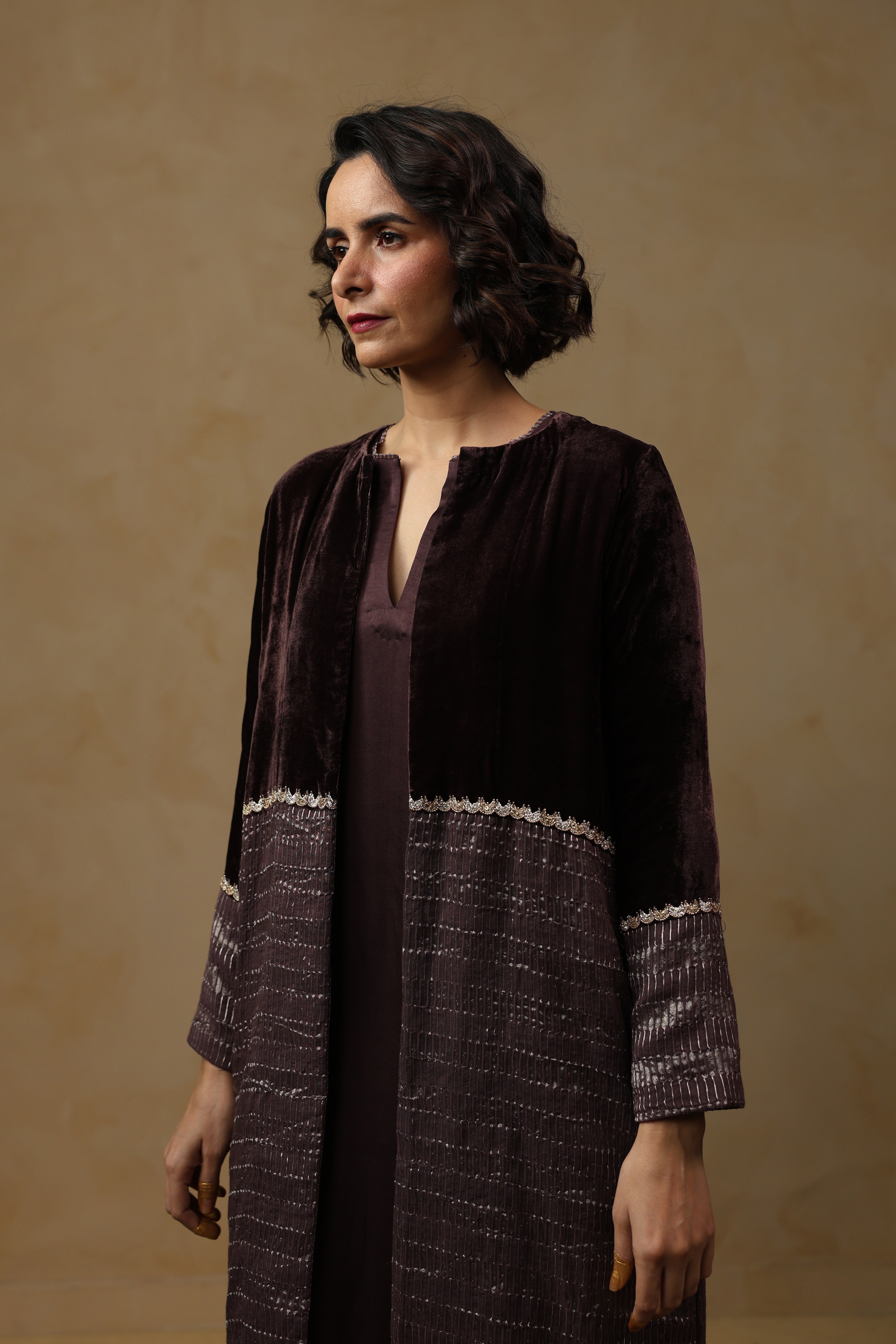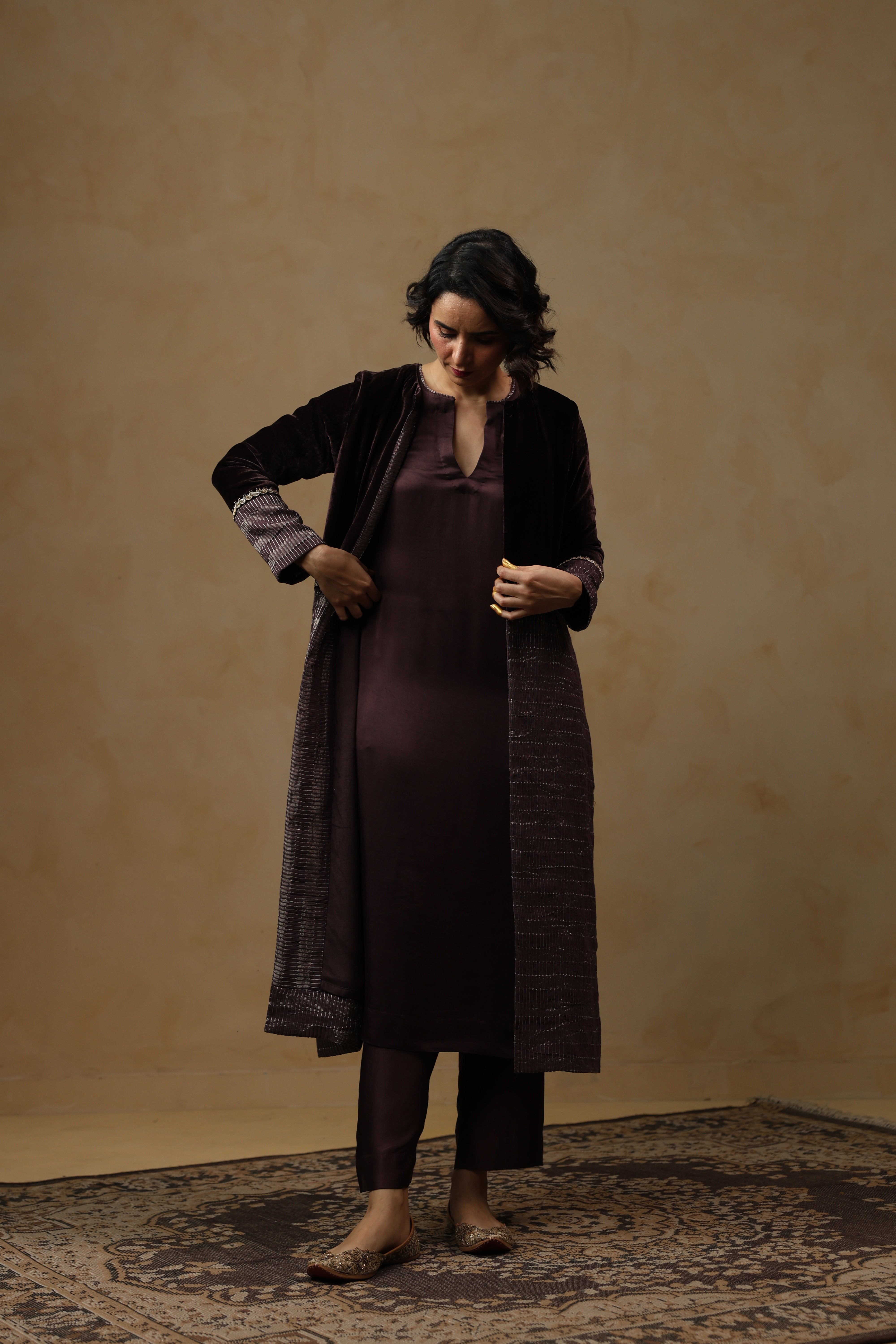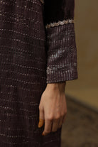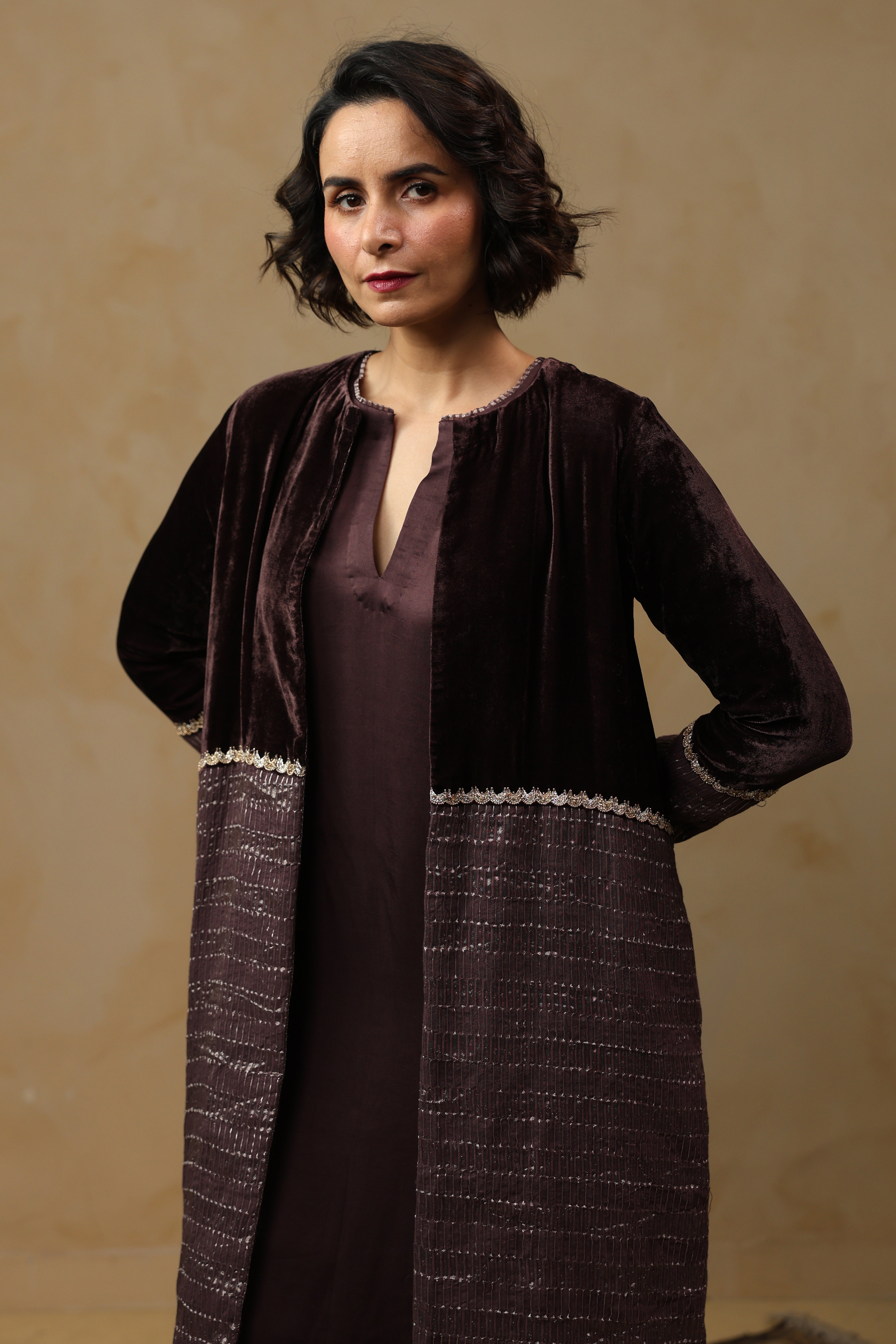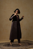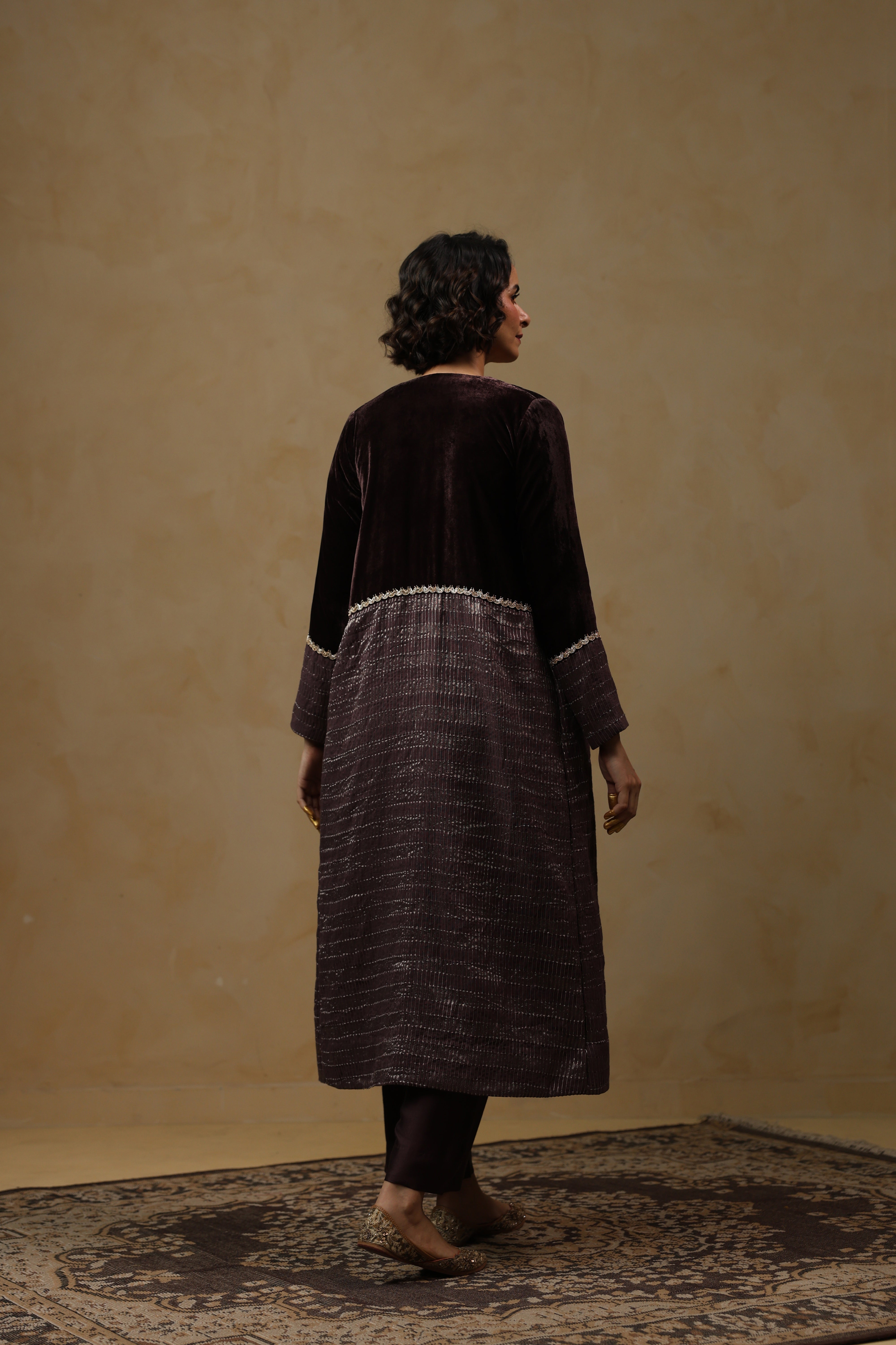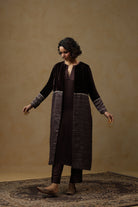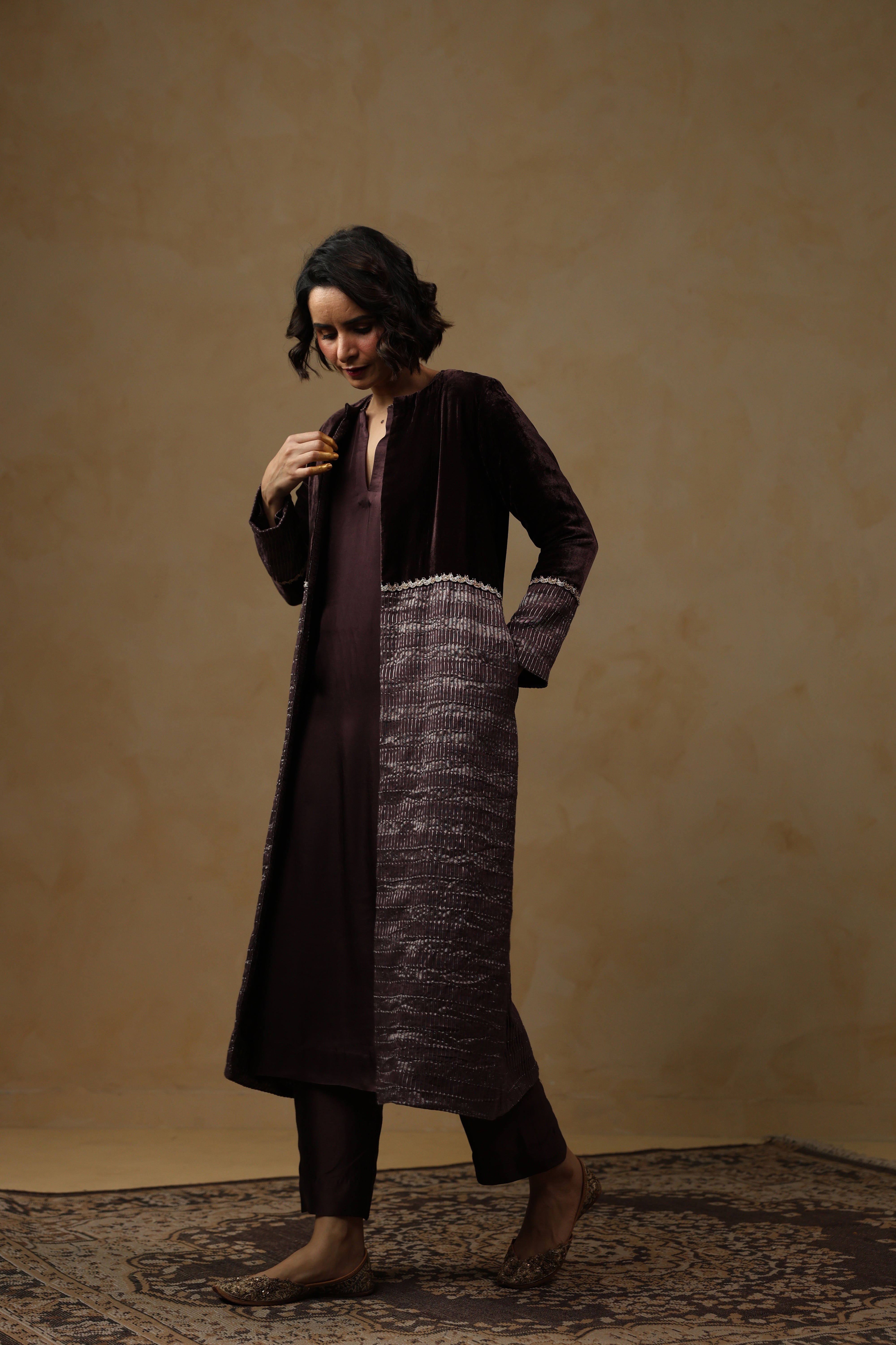 - Outer Coat crafted in velvet and tissue Chanderi, enriched with intricate handwork across the sleeves and body.