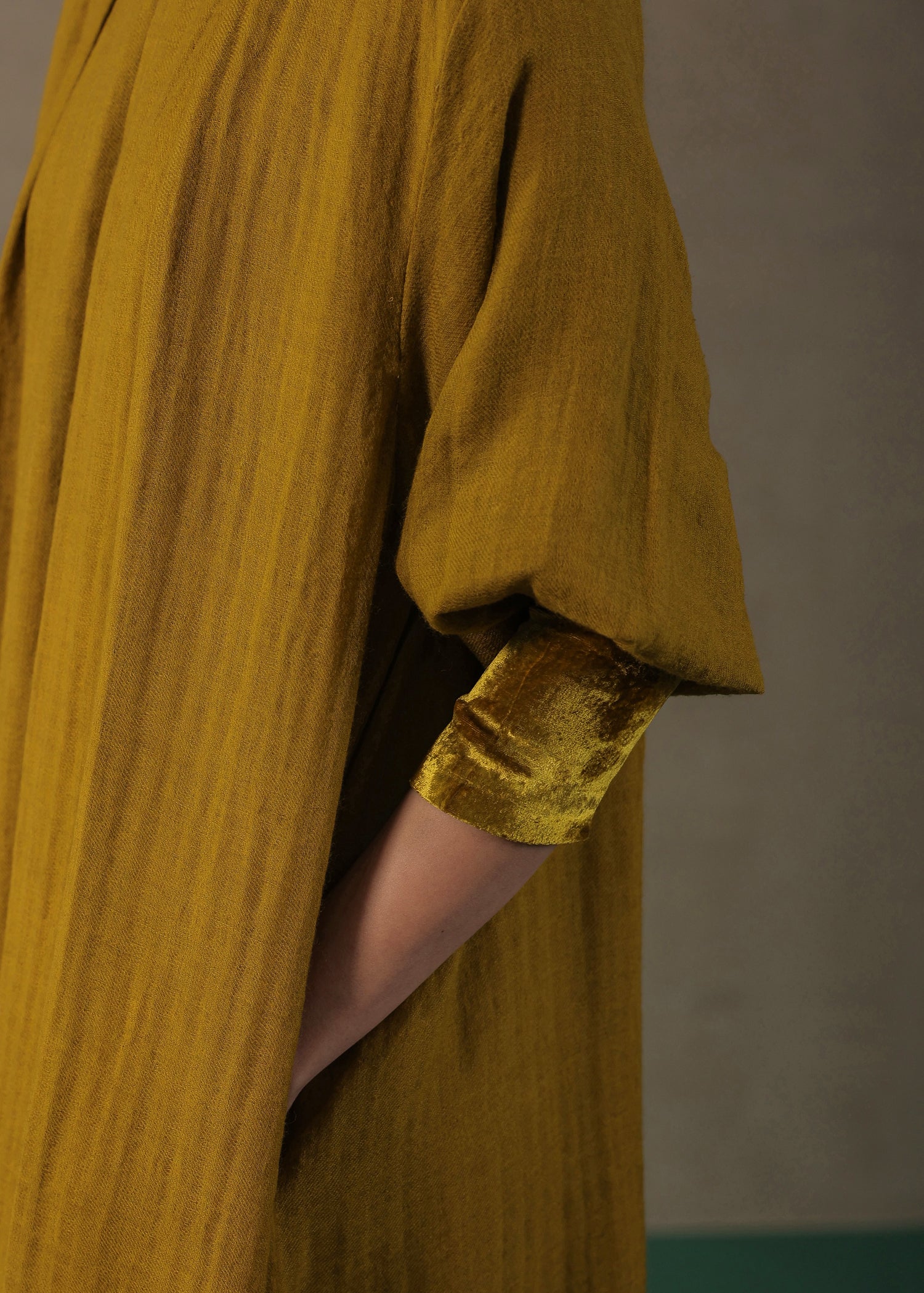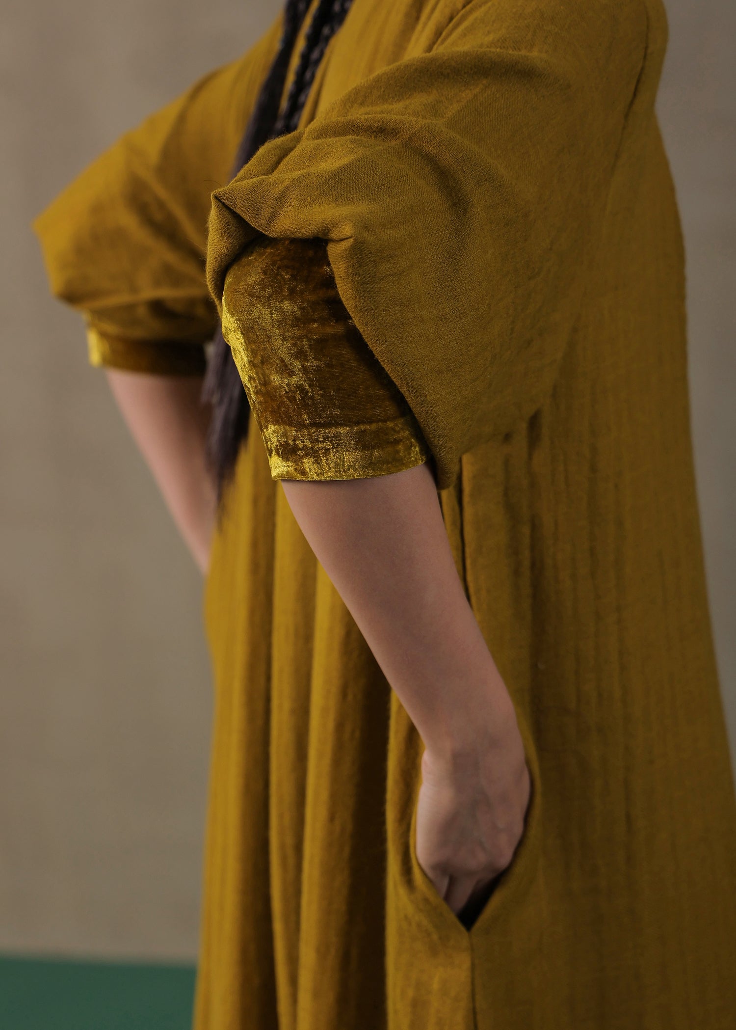 • Oversized Dress with round collared neckline, volume sleeves, velvet cuffs and pockets on both sides.