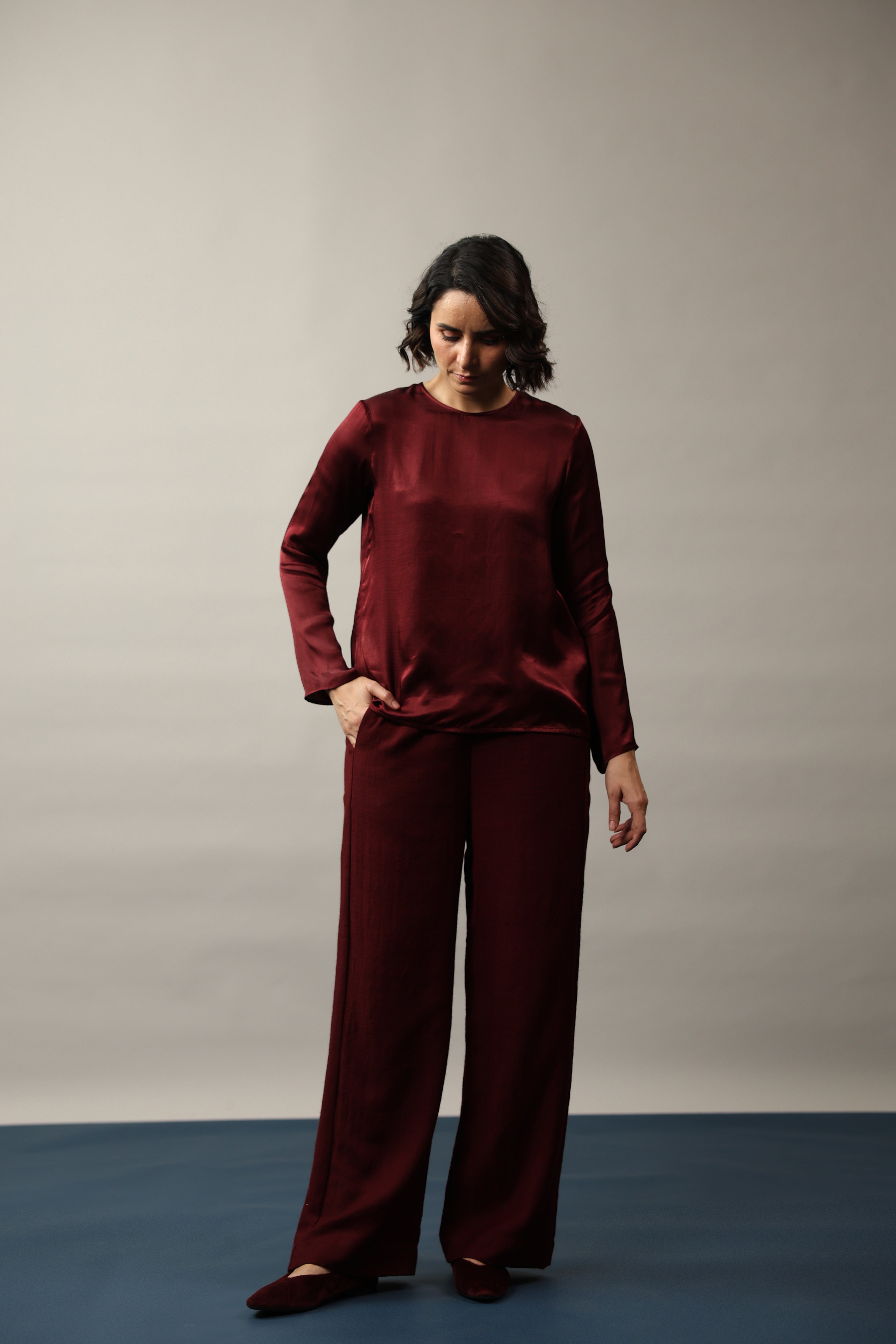 Our model is wearing a size Small in the Maroon colour.