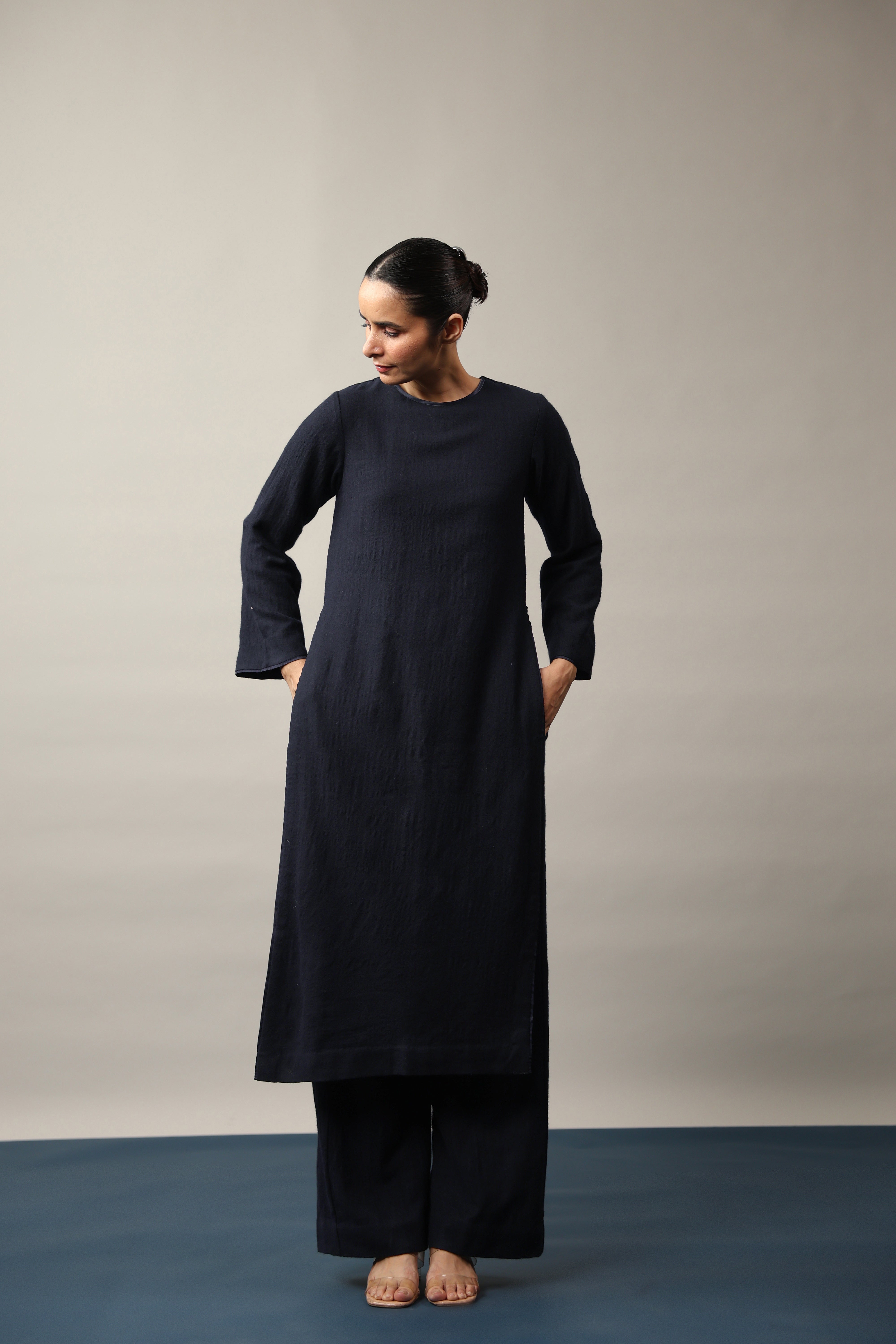 - Straight Fit Kurta featuring a closed round neckline, full length sleeves and high side slits.