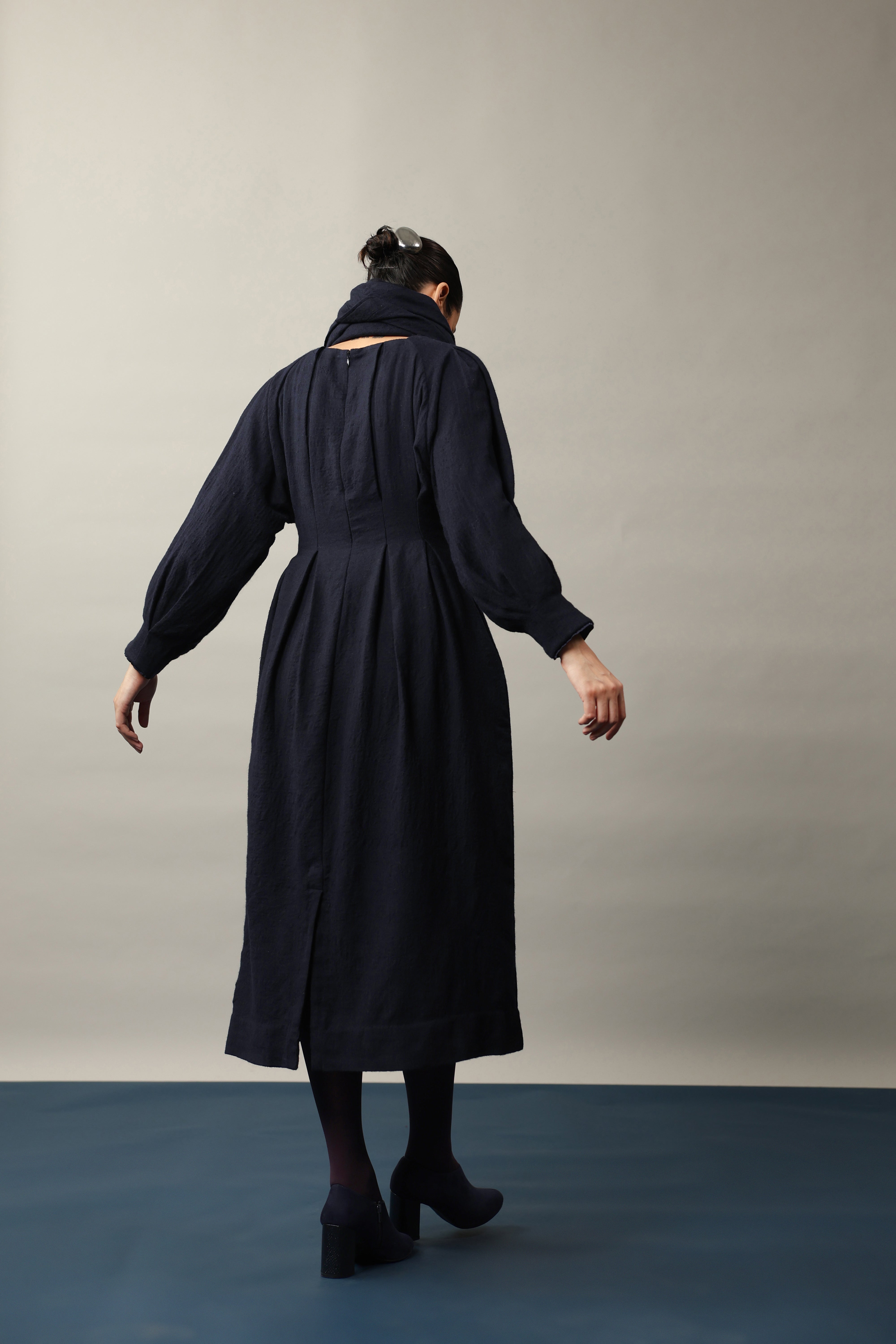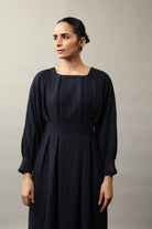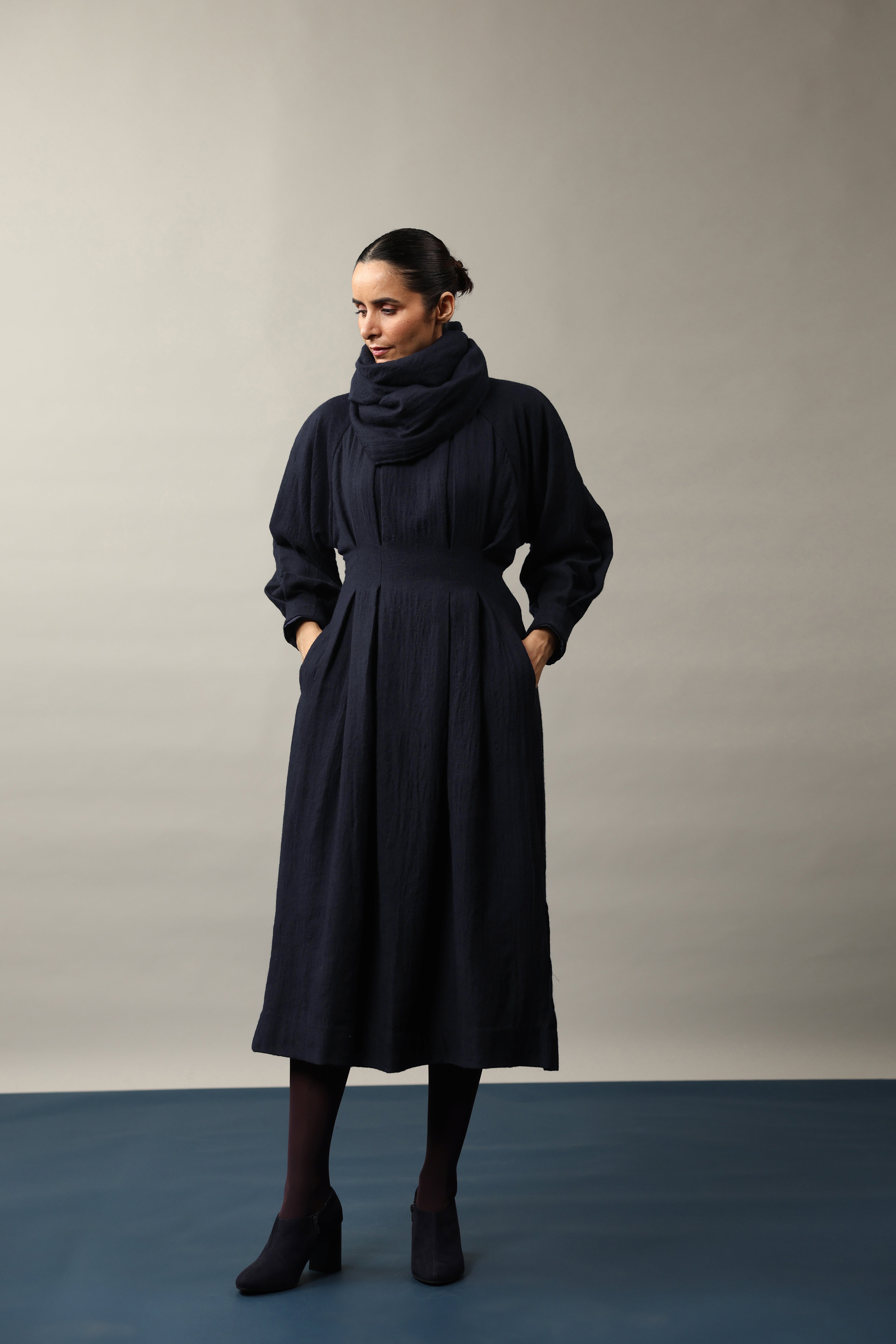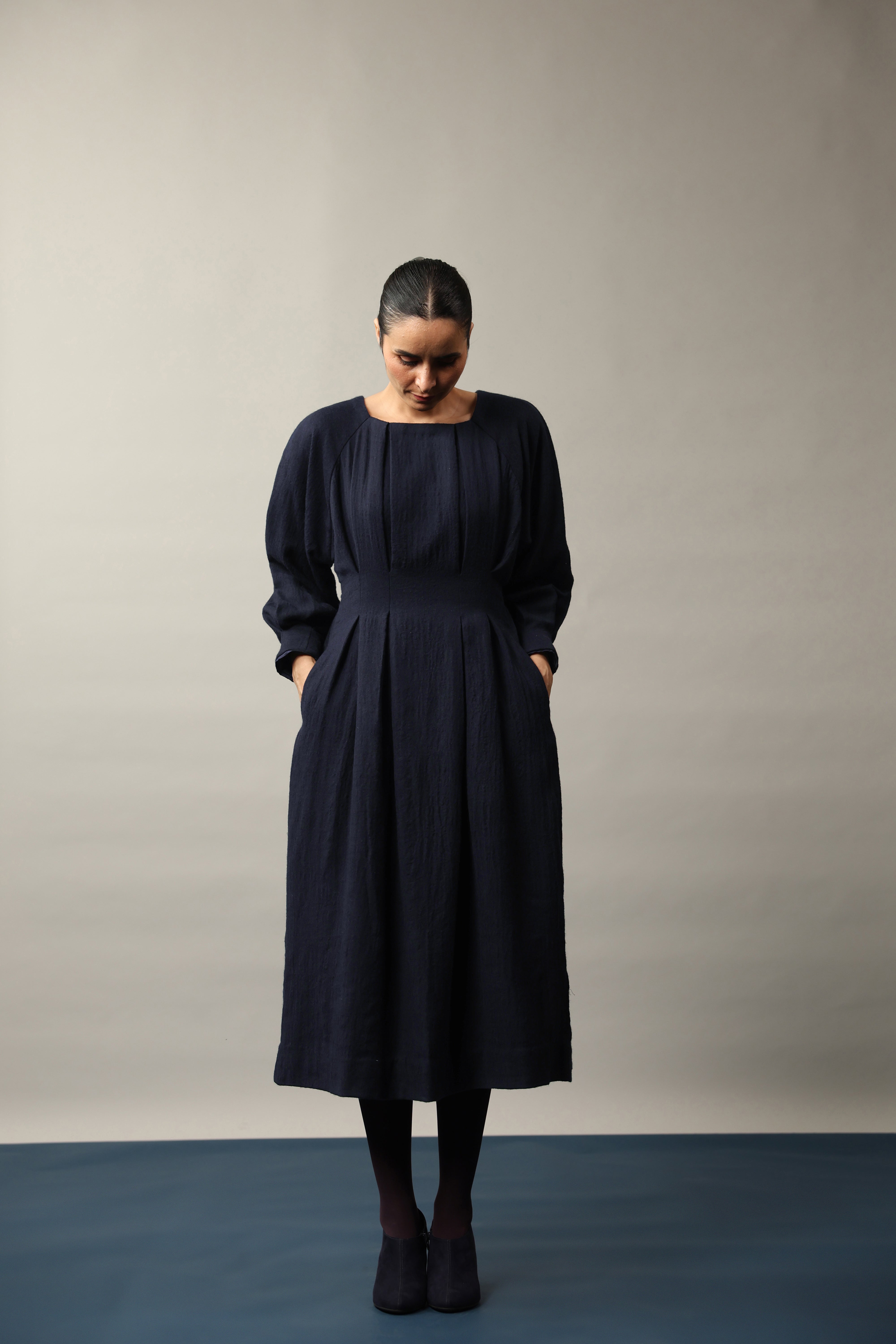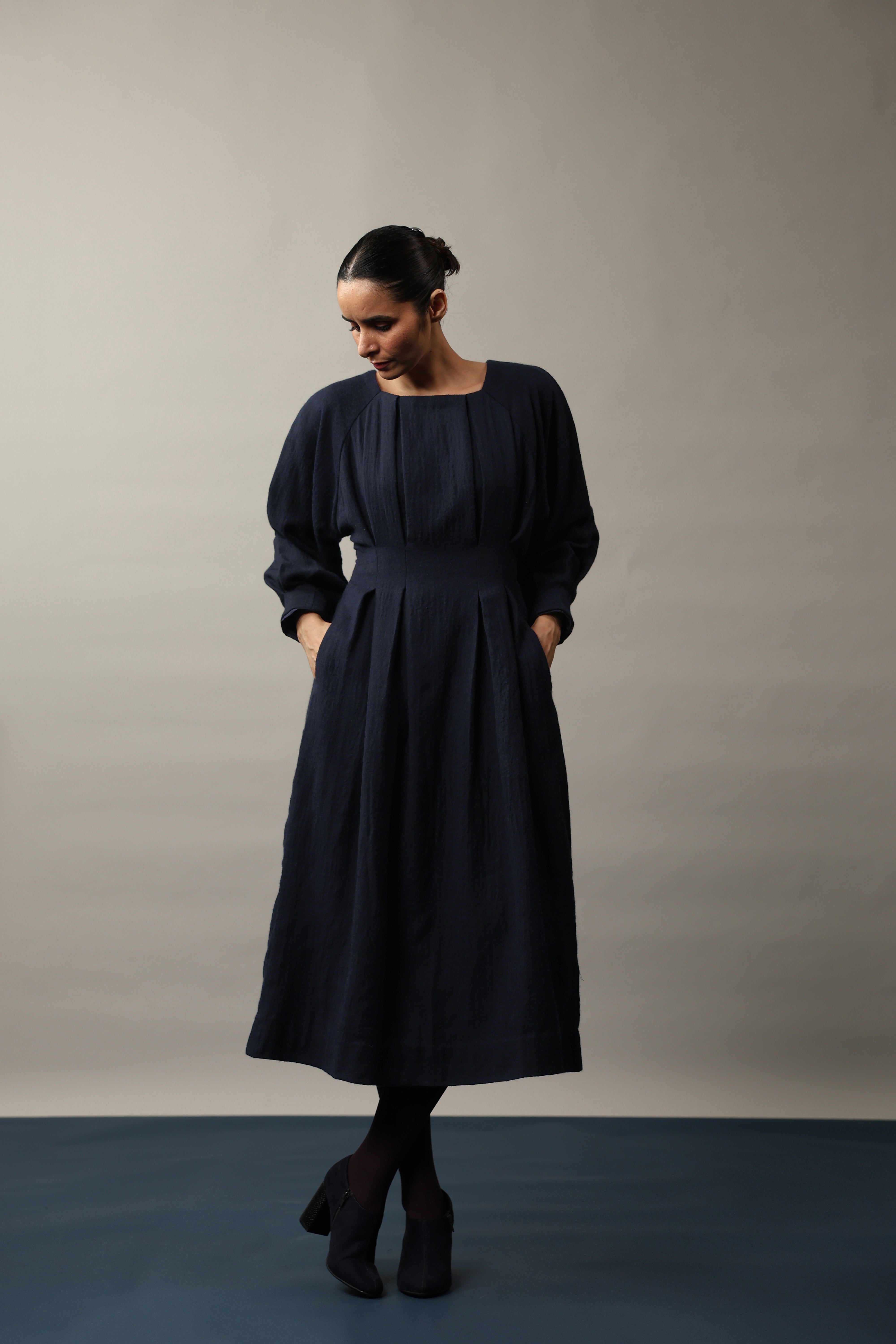 - Mid Calf Length Dress with square neckline, volume sleeves, body fit waist and pockets on both sides.
