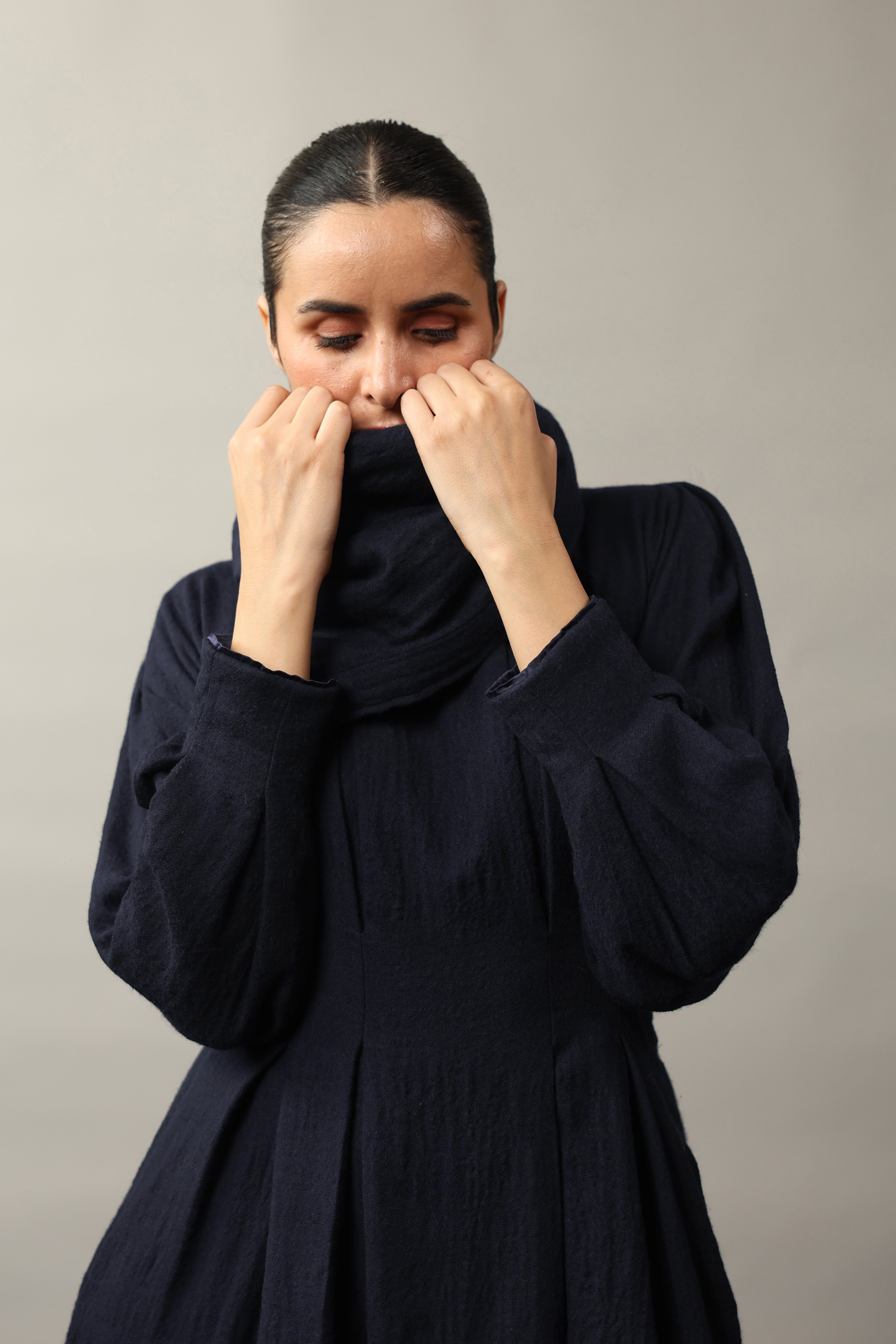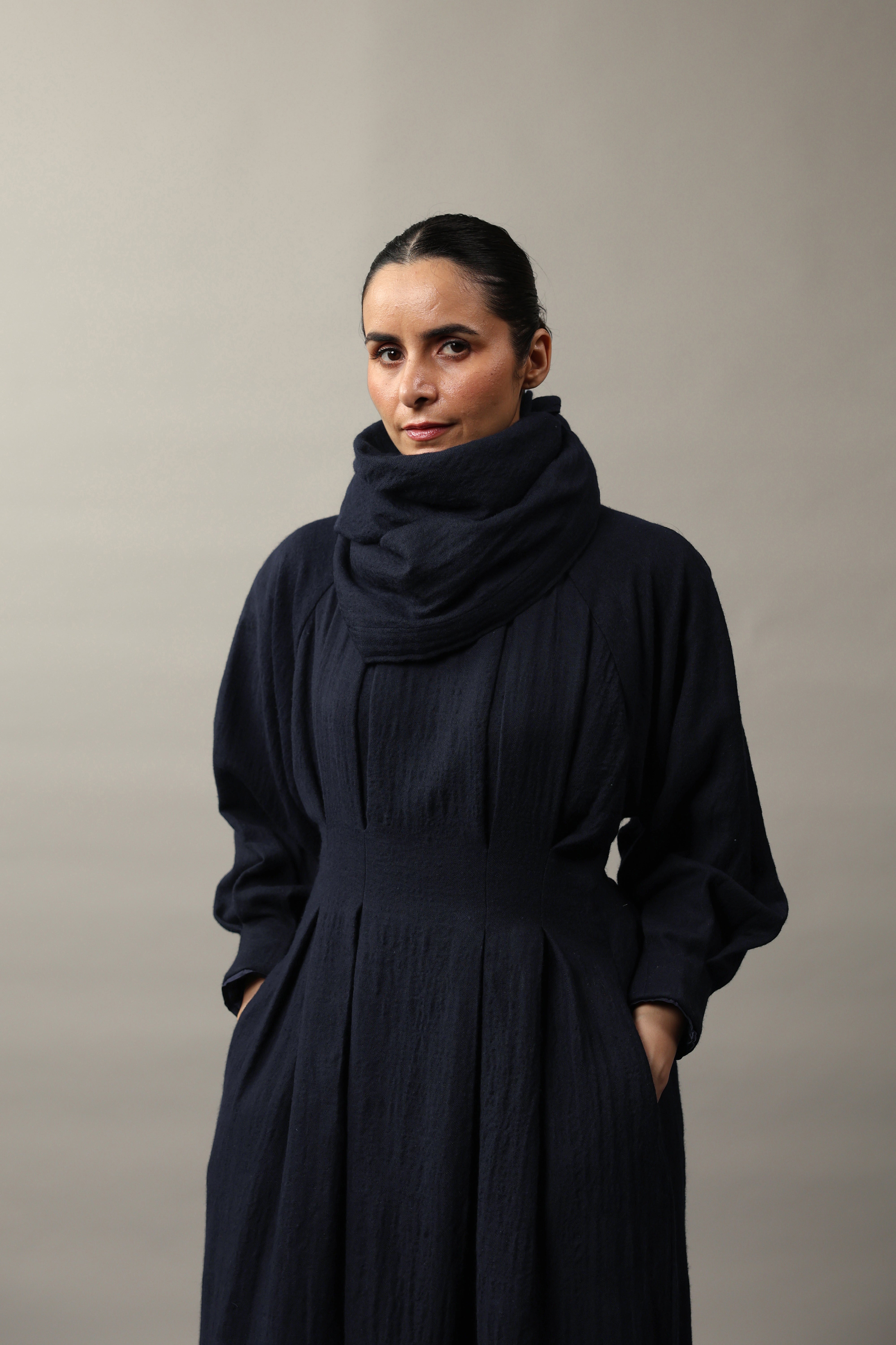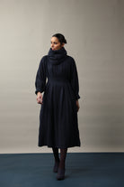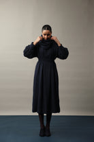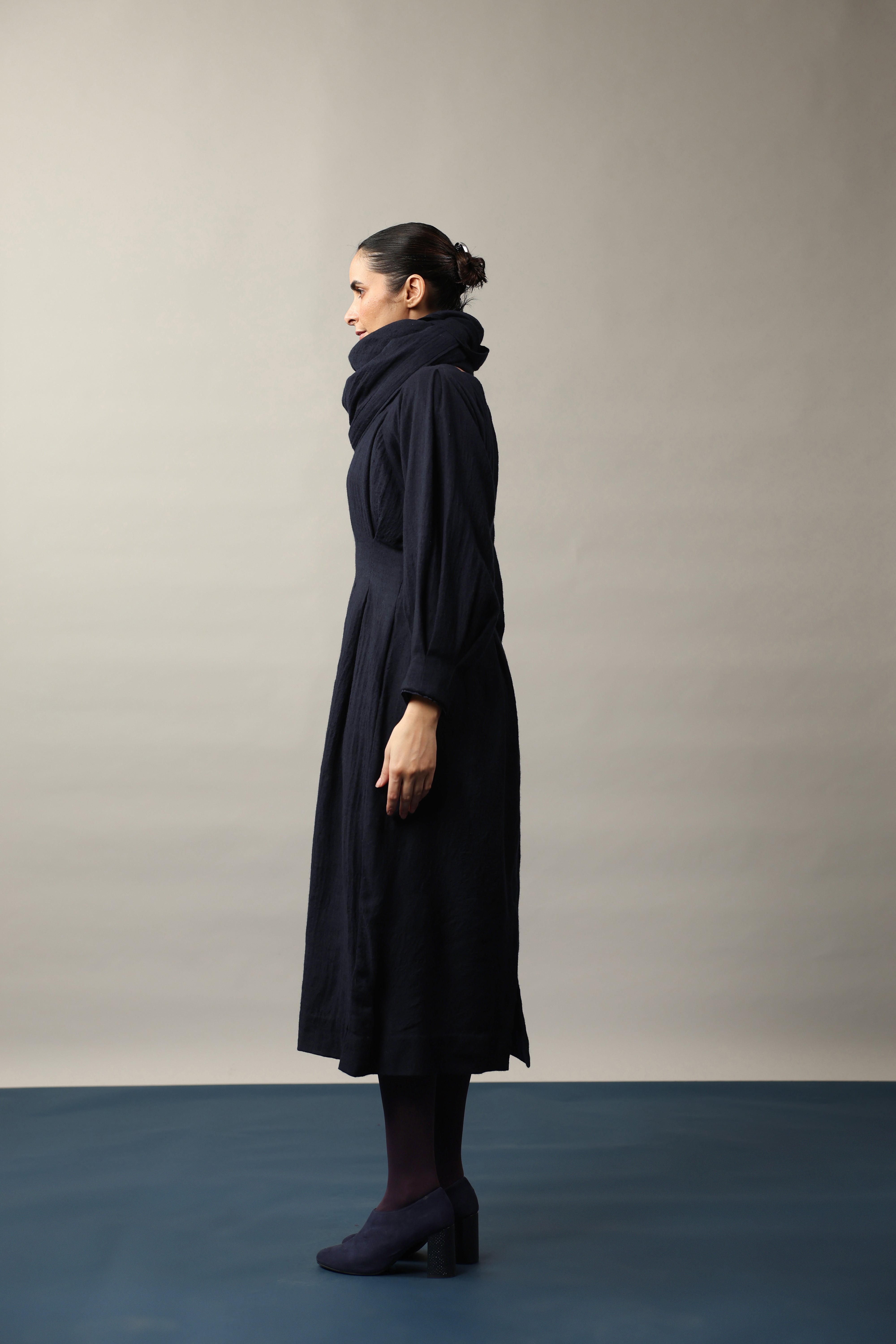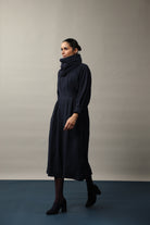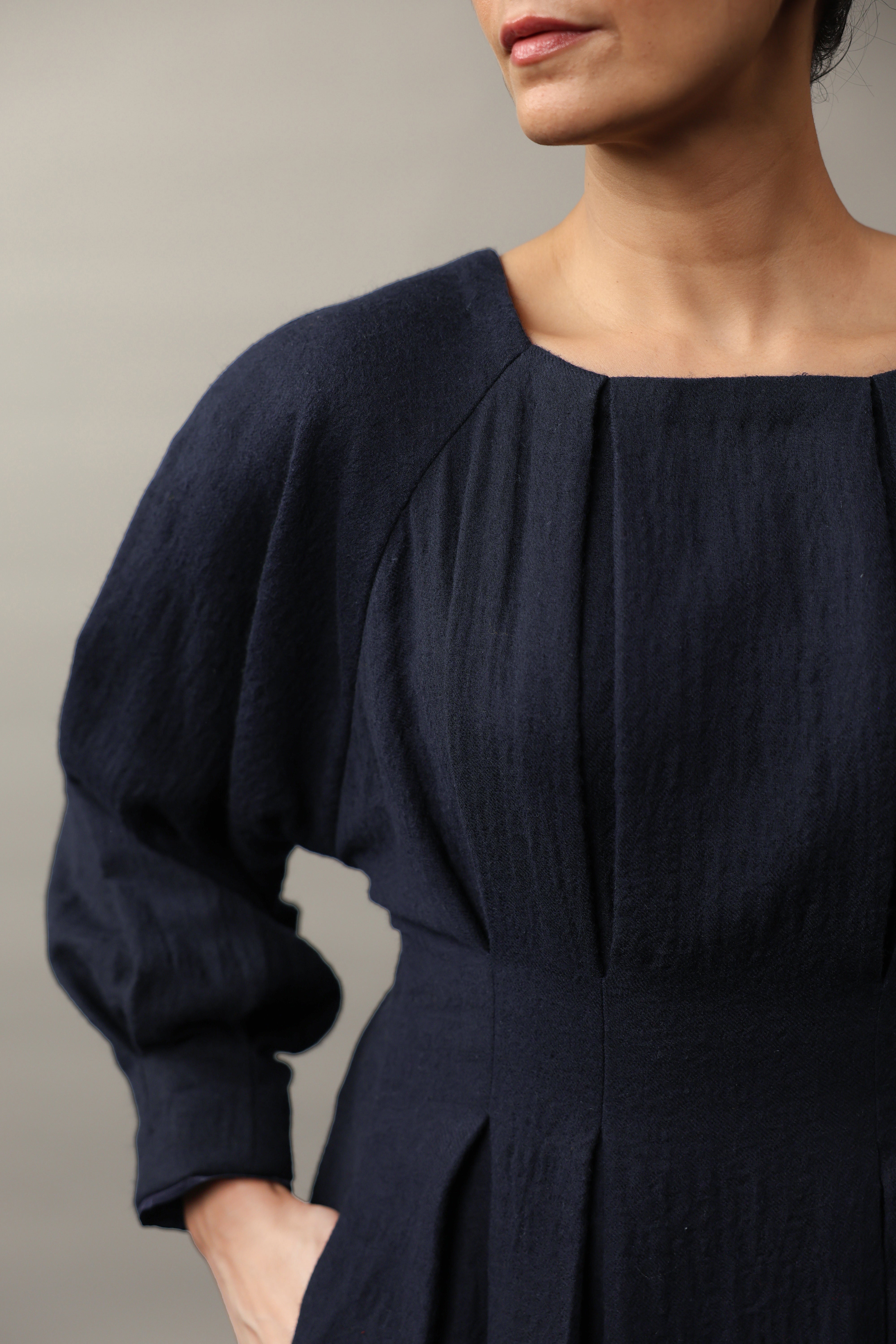 - Mid Calf Length Dress with square neckline, volume sleeves, body fit waist and pockets on both sides.