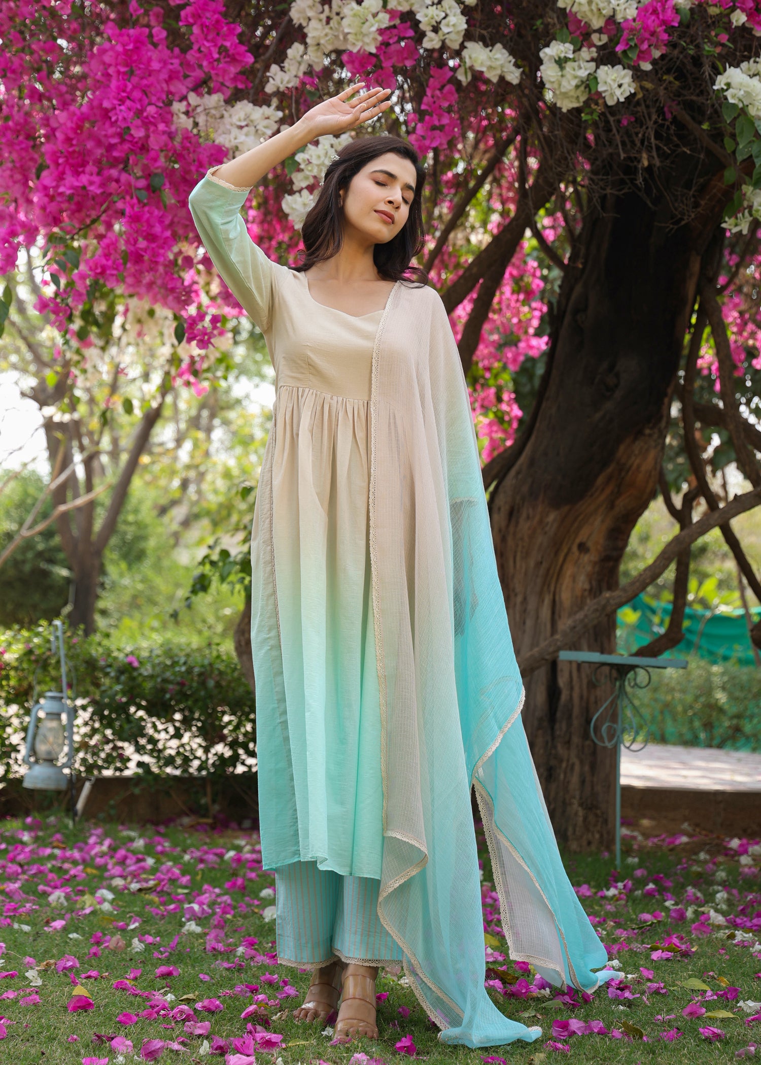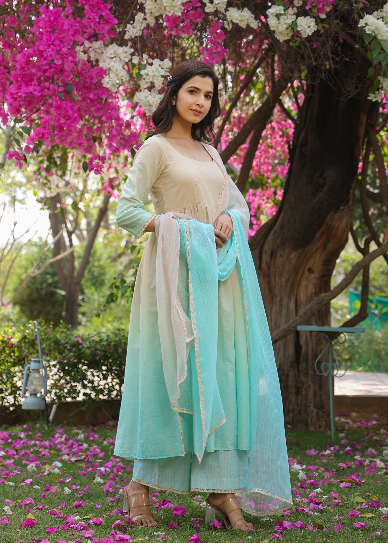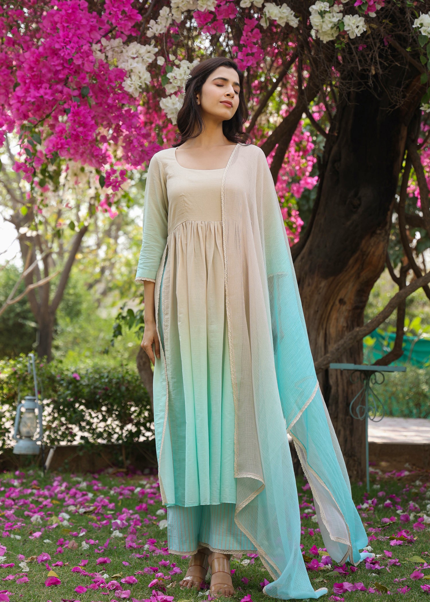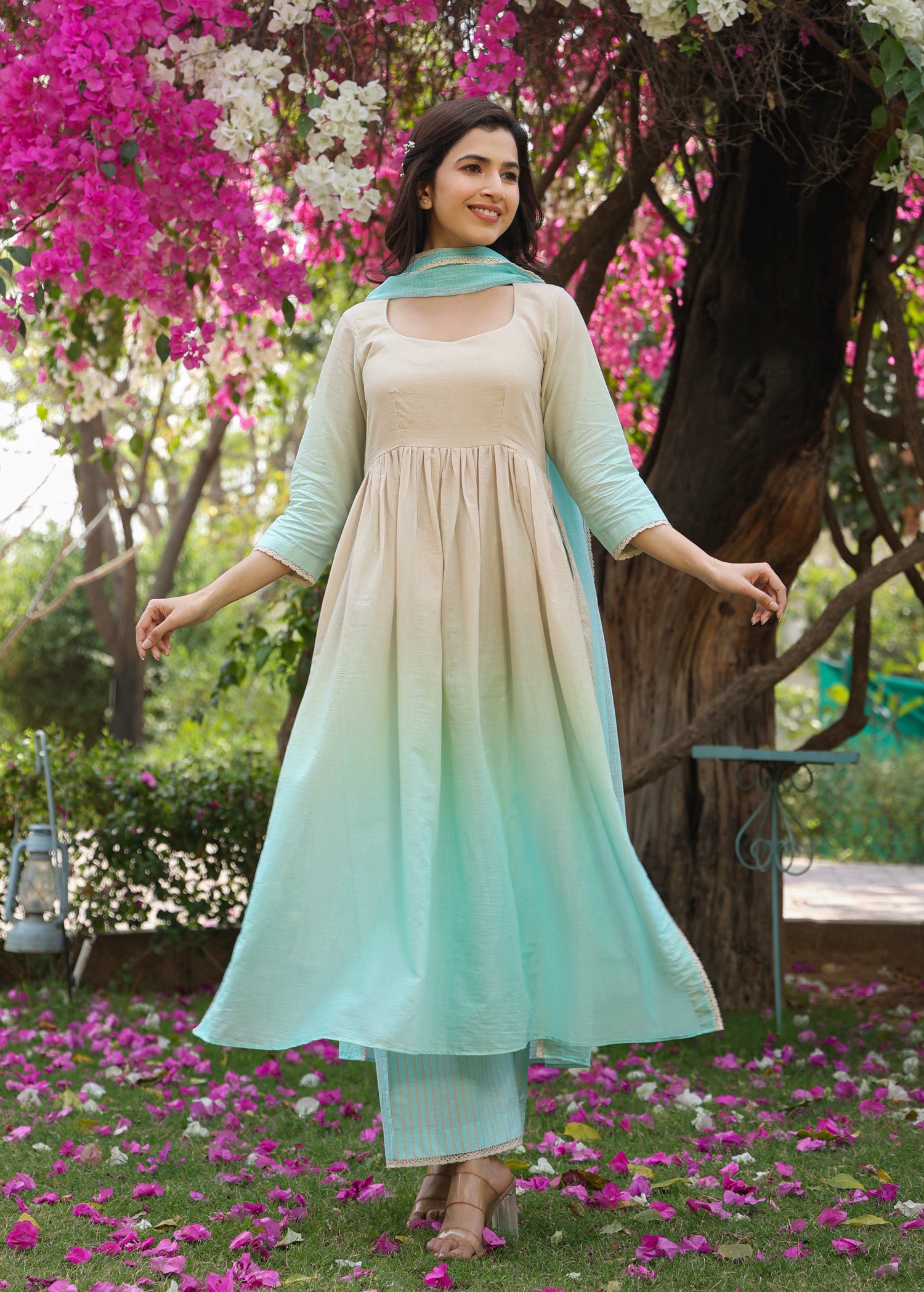 - Ombre Anarkali Kurta that has 3/4 sleeves and lace detailing on side slits.