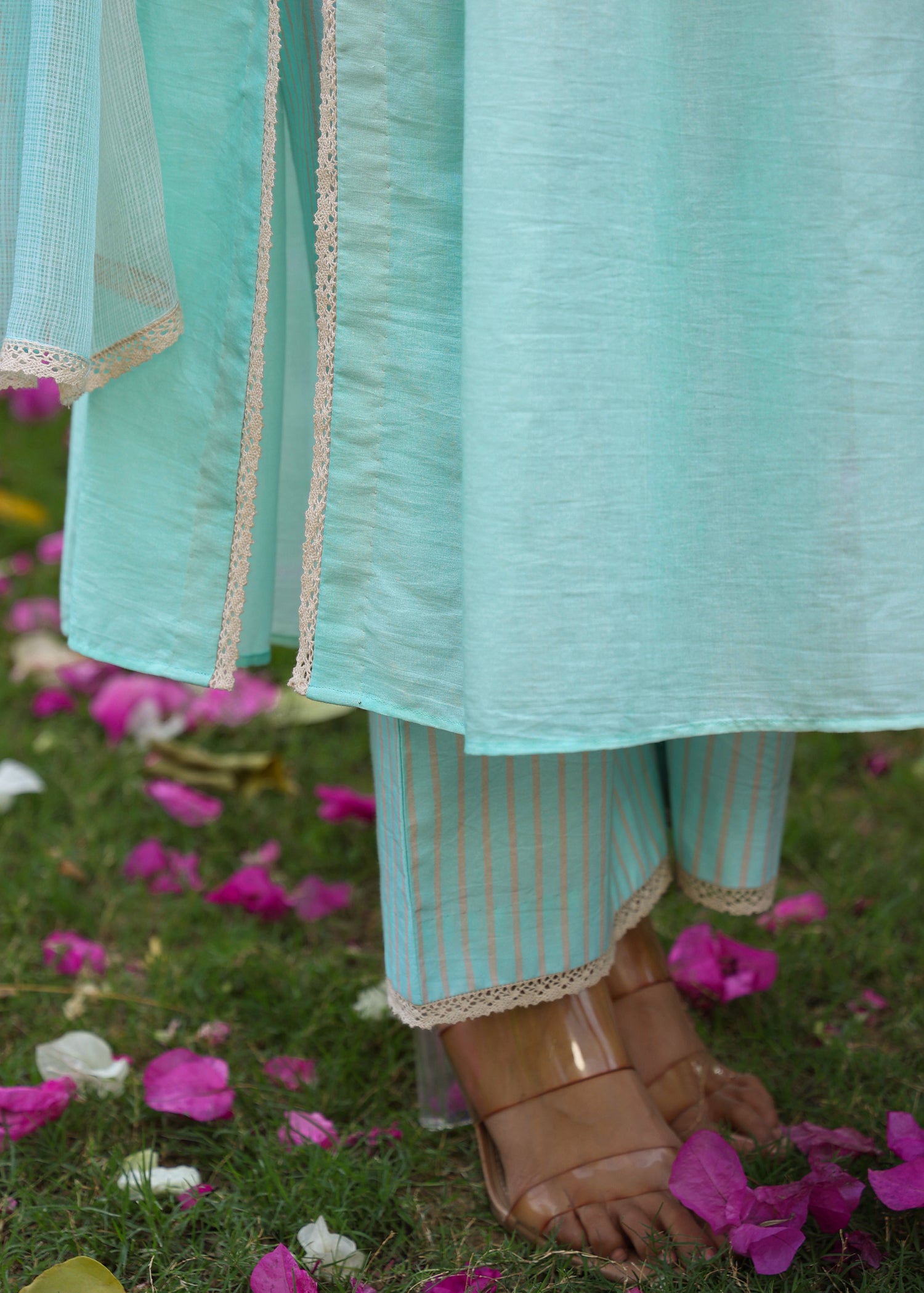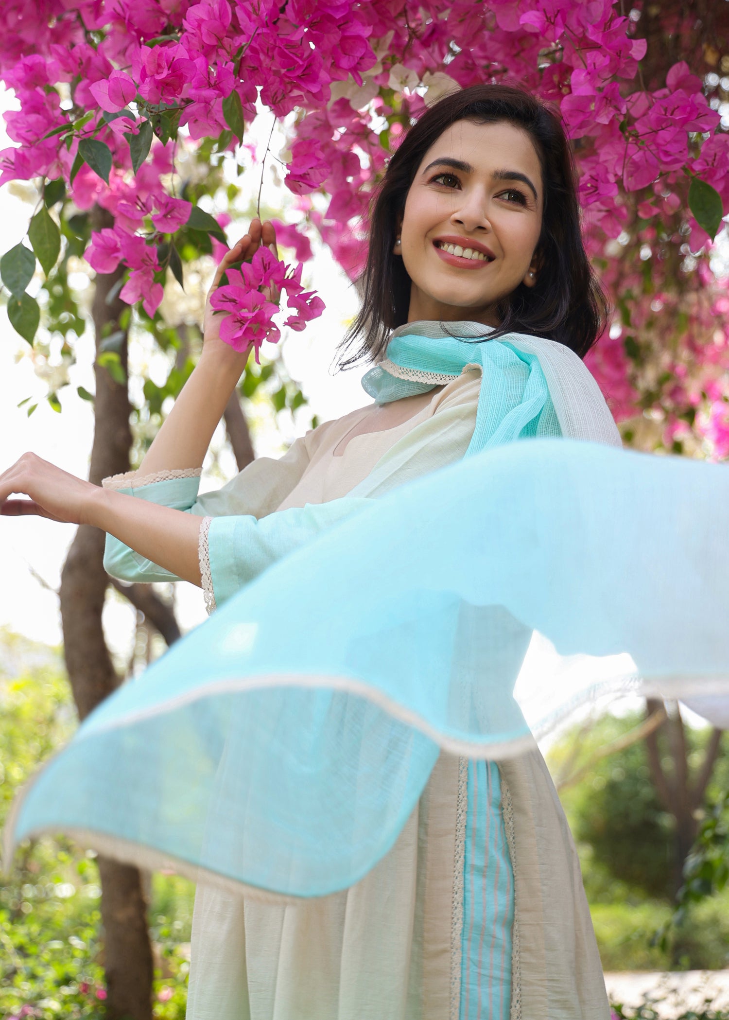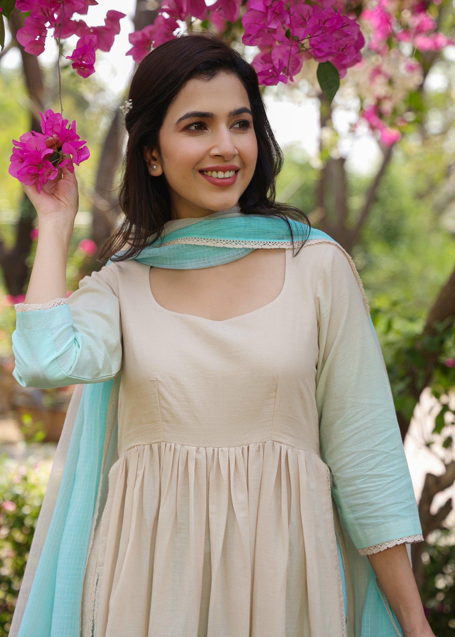 Our muse is wearing size Small and Aqua Blue + Nude Colour.