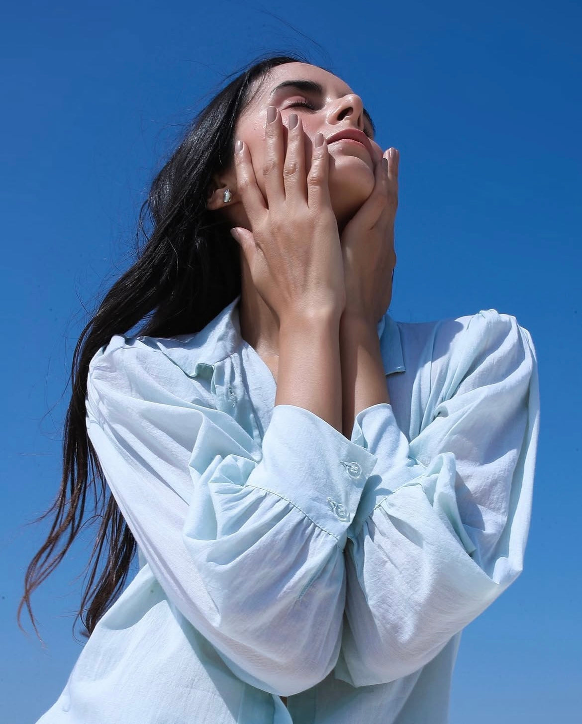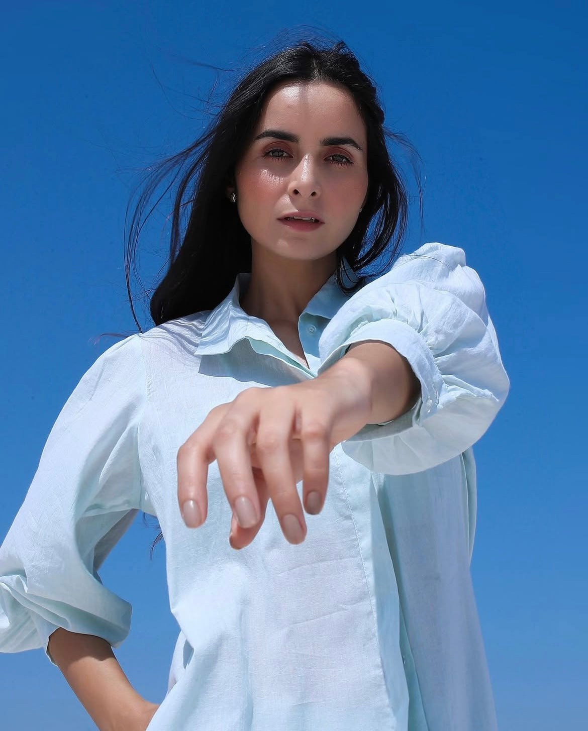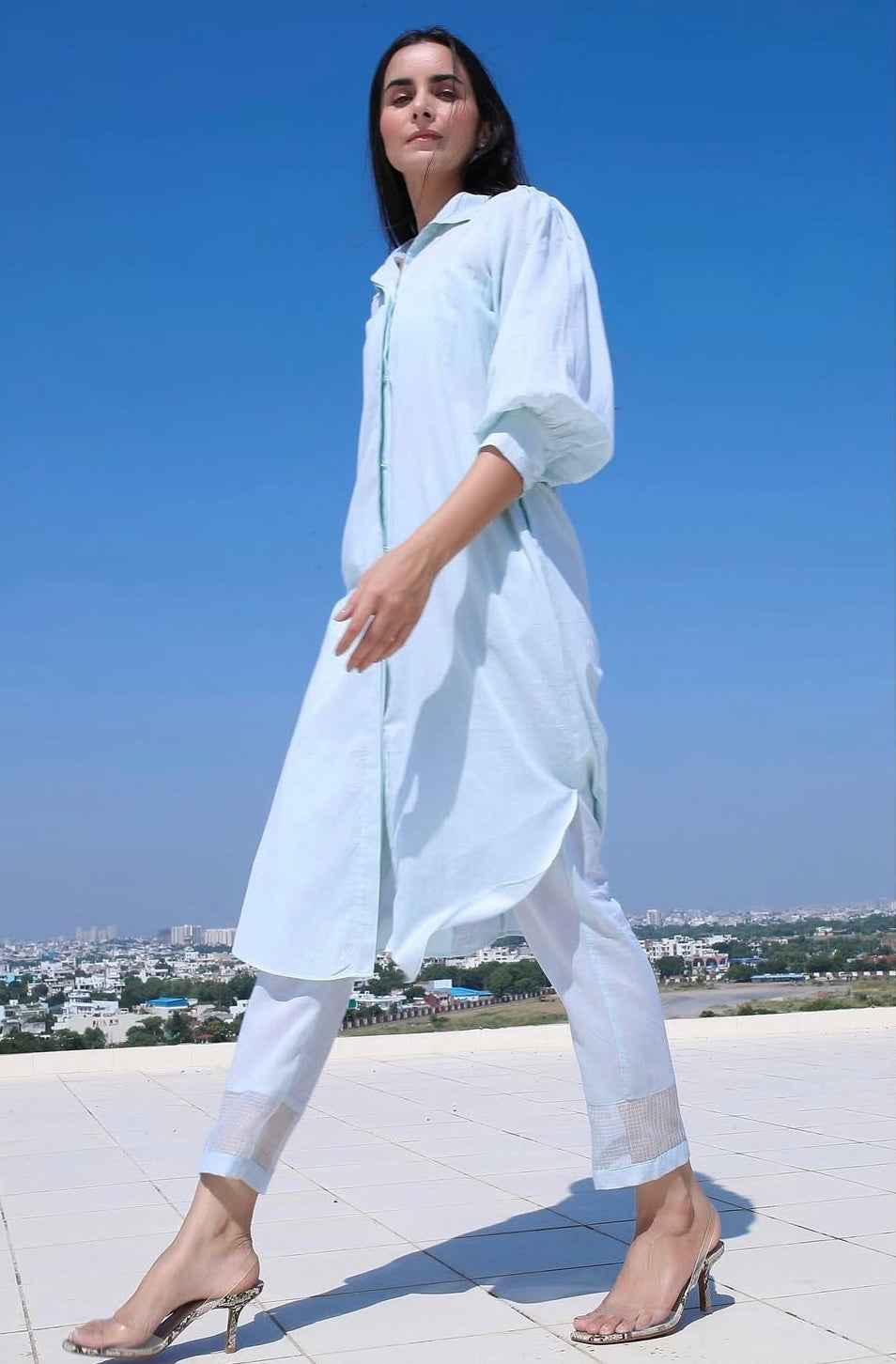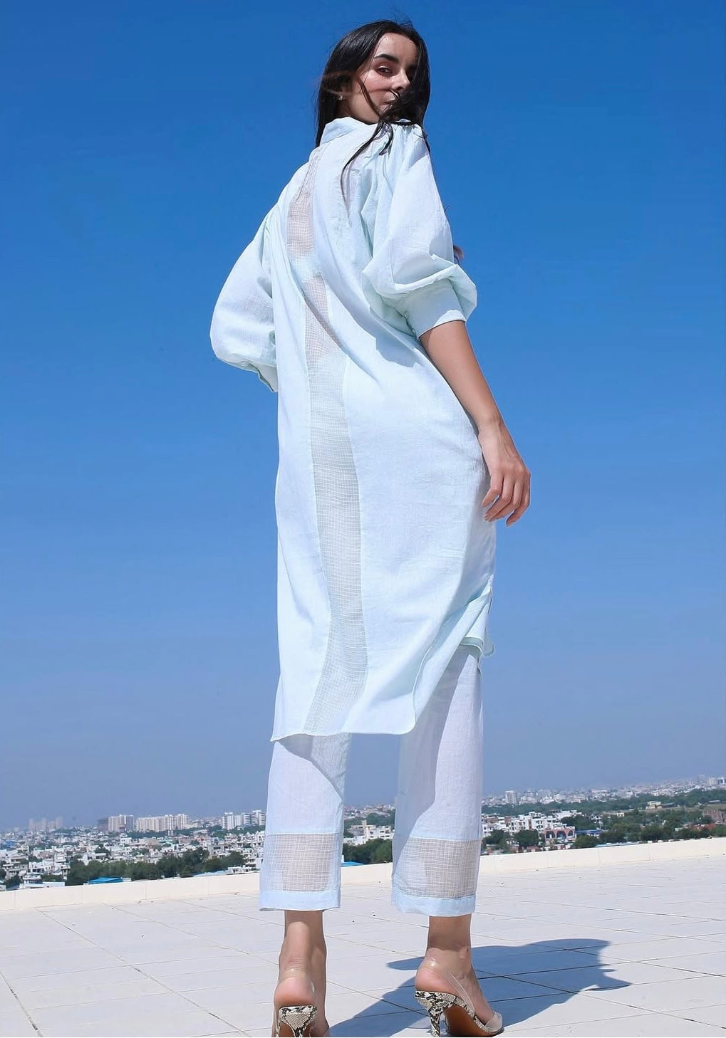 - Long Shirt with front button opening, extended cuff sleeves and doriya panel detailing at the back.