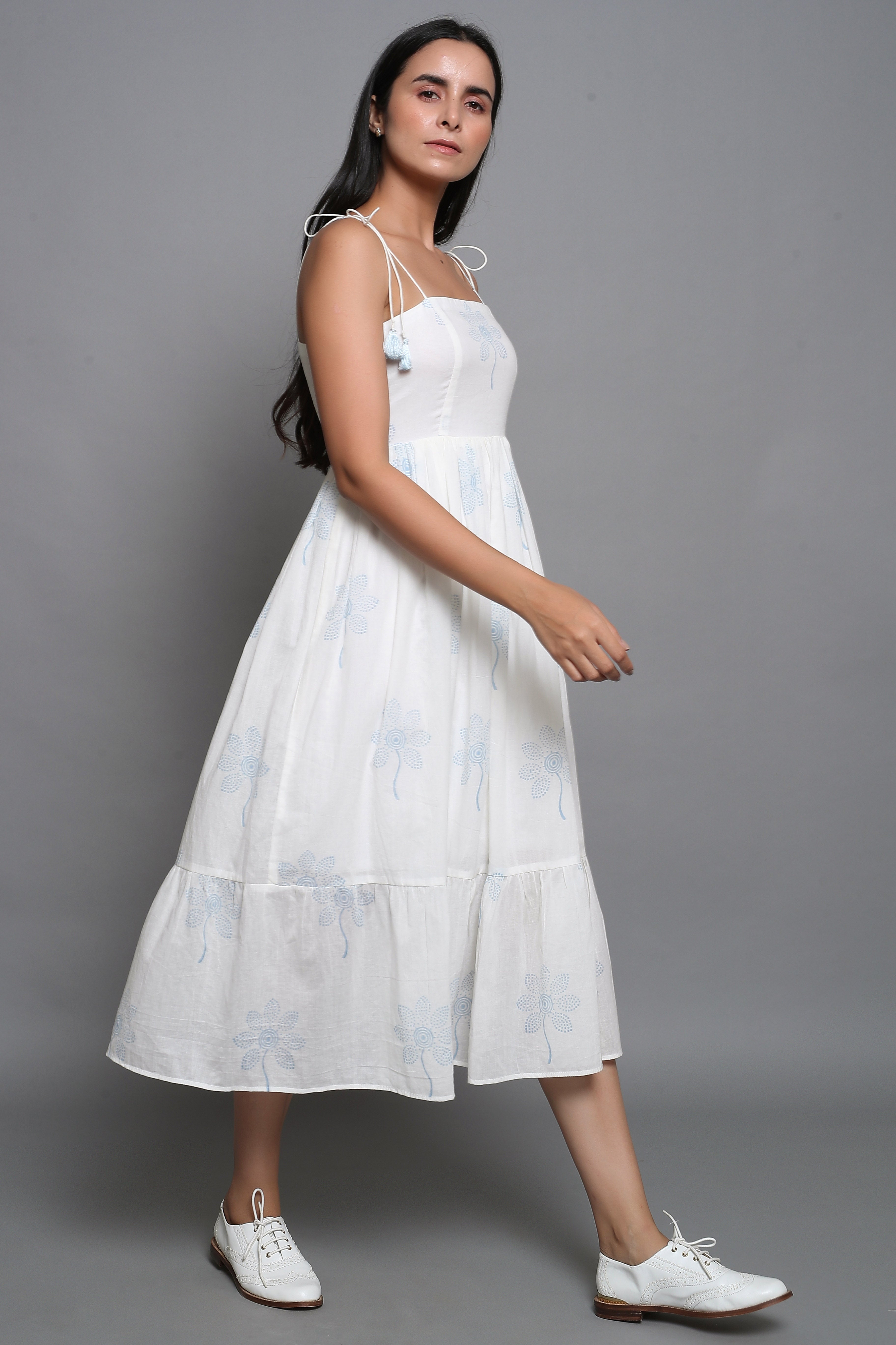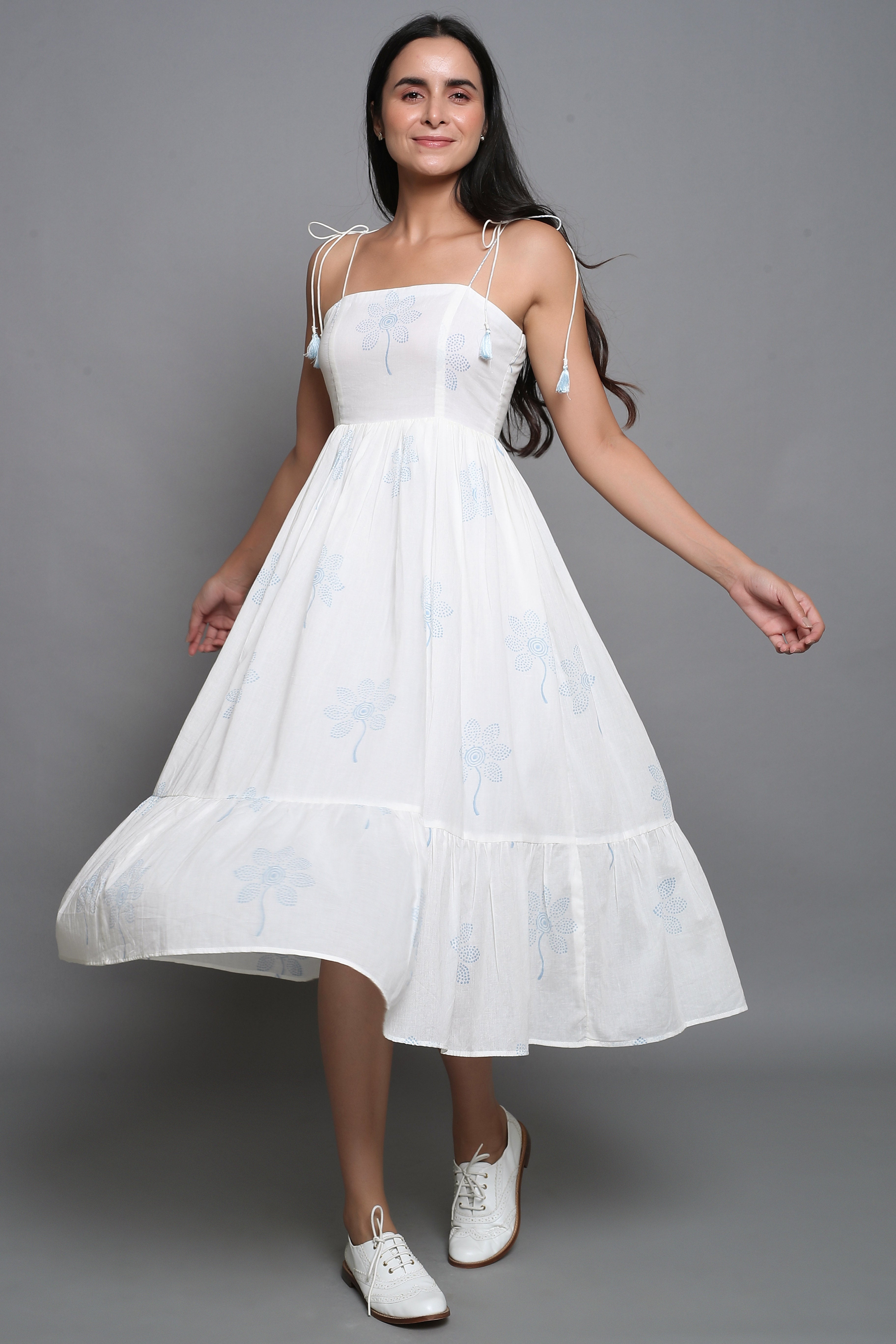 This Shoulder Tie Up Dress has gathering around the waistline and elasticated back.